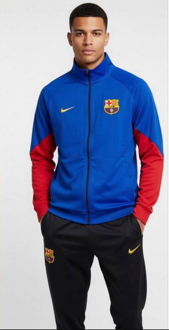 Nike FC Barcelona sweatshirt, dar kesim, bisiklet yaka ve uzun kollu. Koyu mavi gövde, kırmızı kollar ve baskılı logolar. Yumuşak kürk dokulu kumaş. Ön fermuar velcro detaylı.