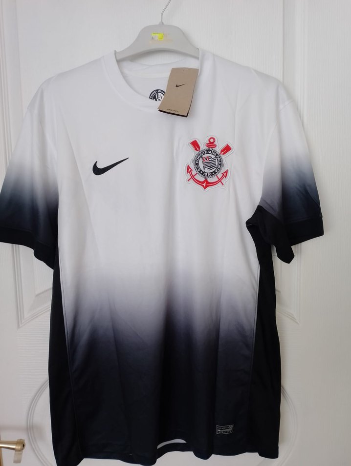Nike erkek tişört, kısa kollu ve bisiklet yaka. Beyazdan siyaha geçişli baskılı, düğmeli detaylı, sentetik kumaştan, spor için uygun. ⚽