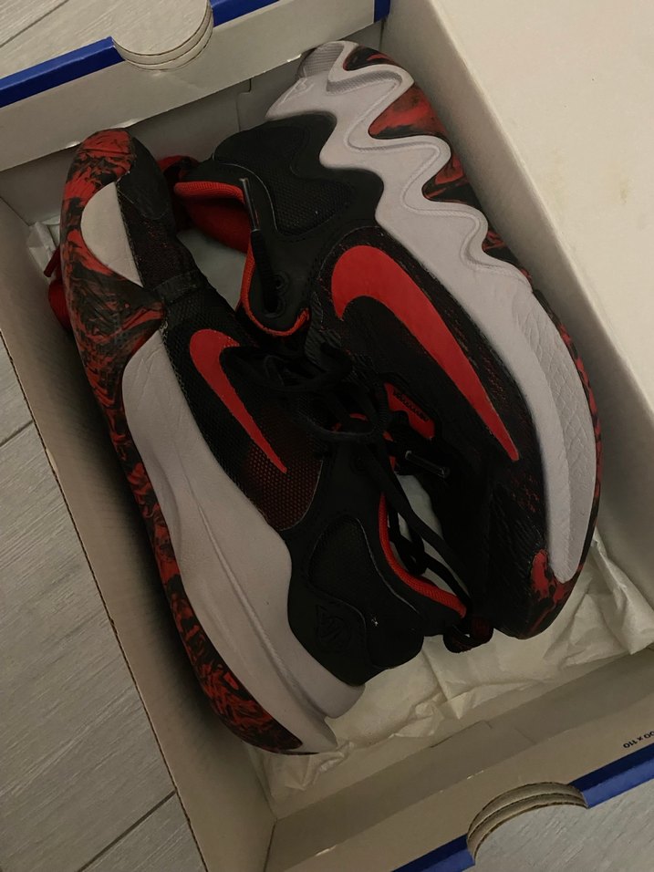 Kırmızı ve siyah baskılı desene sahip, kauçuk tabanlı ve bağcıklı basketbol ayakkabısı, sokak giyimi ve spor için uygun. 1 sezon giydim biraz yıprandı ama taban tutuşu hâla çok iyi durumda.