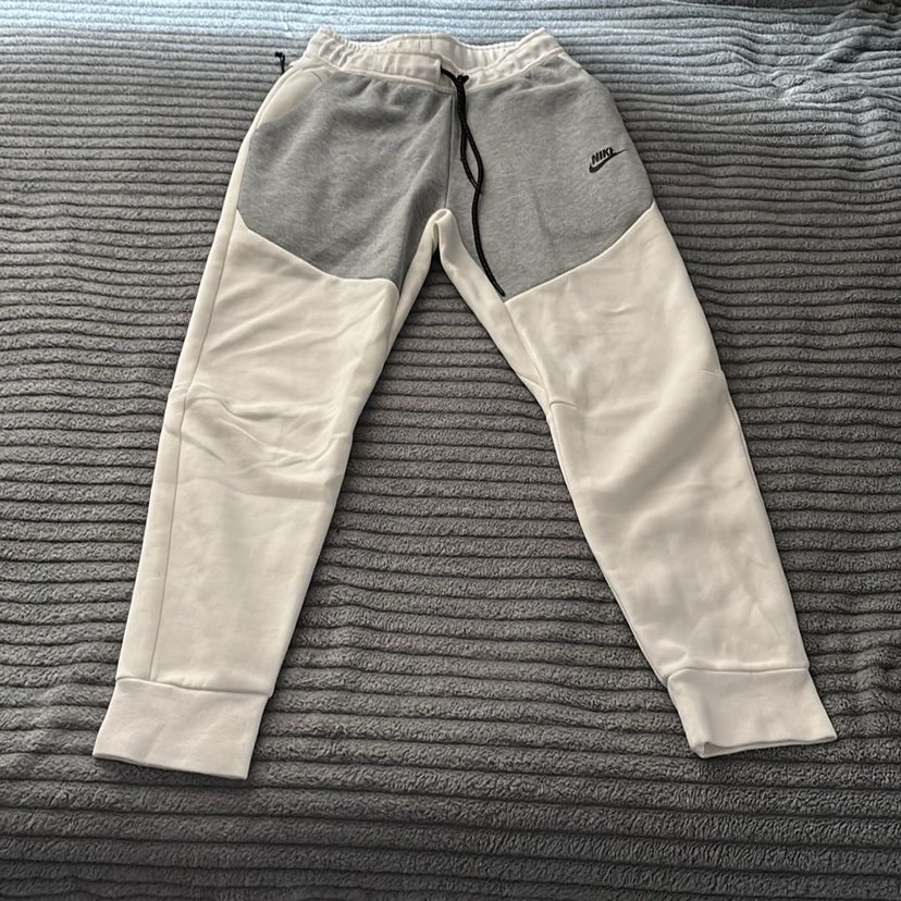 Nike marka, elastik bel ve bağcık detaylı, gri üst ve beyaz alt parçalı rahat eşofman altı. tech fleece