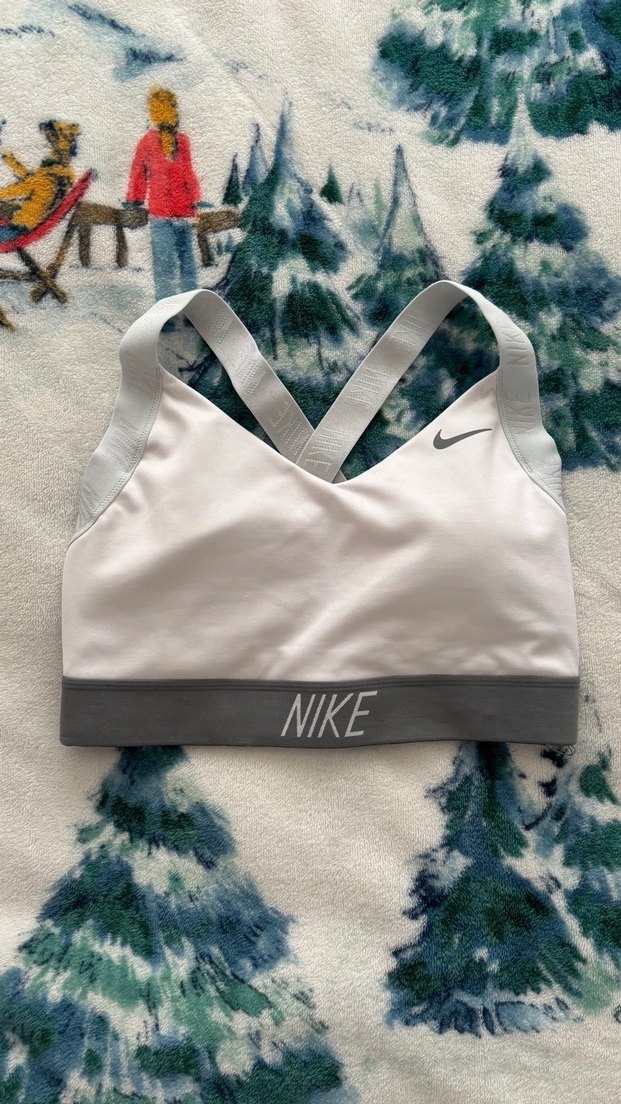 Nike markalı, çapraz askılı, beyaz üst ve gri bantlı, baskılı logolu spor sütyeni. ️♀️