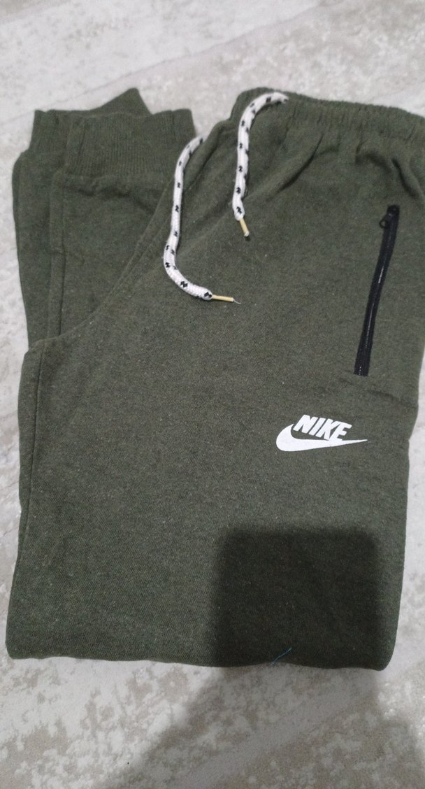 Nike markalı haki renkte, fermuarlı cepleri olan, rahat sentetik kumaştan yapılmış, normal boyda