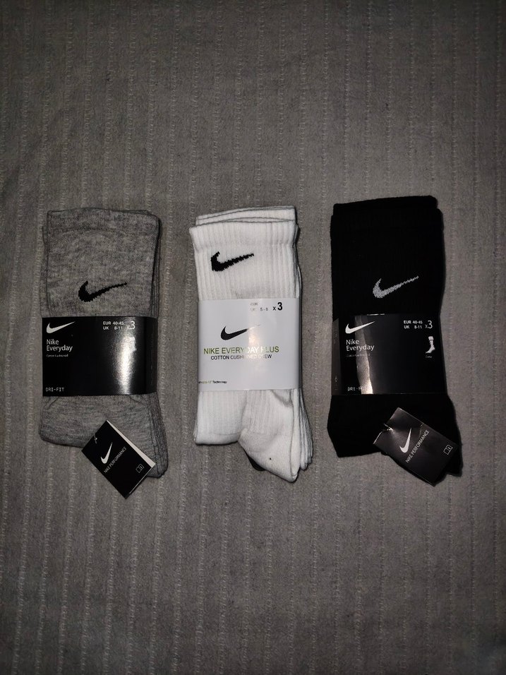 Nike marka gri, beyaz ve siyah renklerde, normal uzunlukta, erkek spor çorapları 3'lü paket halinde. orjinale yakın kalitede çoraplar bu ilanı almayın iletişime geçin ilan açarım 3lü olarak 150 lira