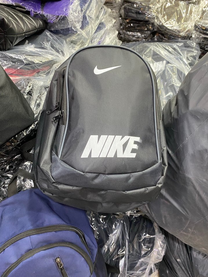 Sıfır ürün Gri renkte, fermuarlı bölmeleri ve baskılı Nike logosu ile dikkat çeken erkek sırt çantası.