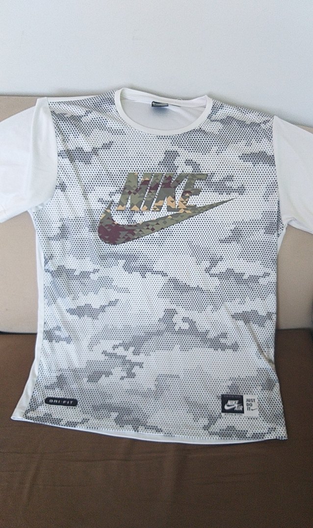 Nike marka, gri kamuflaj baskılı, kısa kollu, yuvarlak yaka, bol kesim kadın tişörtü. Sentetik kumaştan, günlük kullanıma uygun