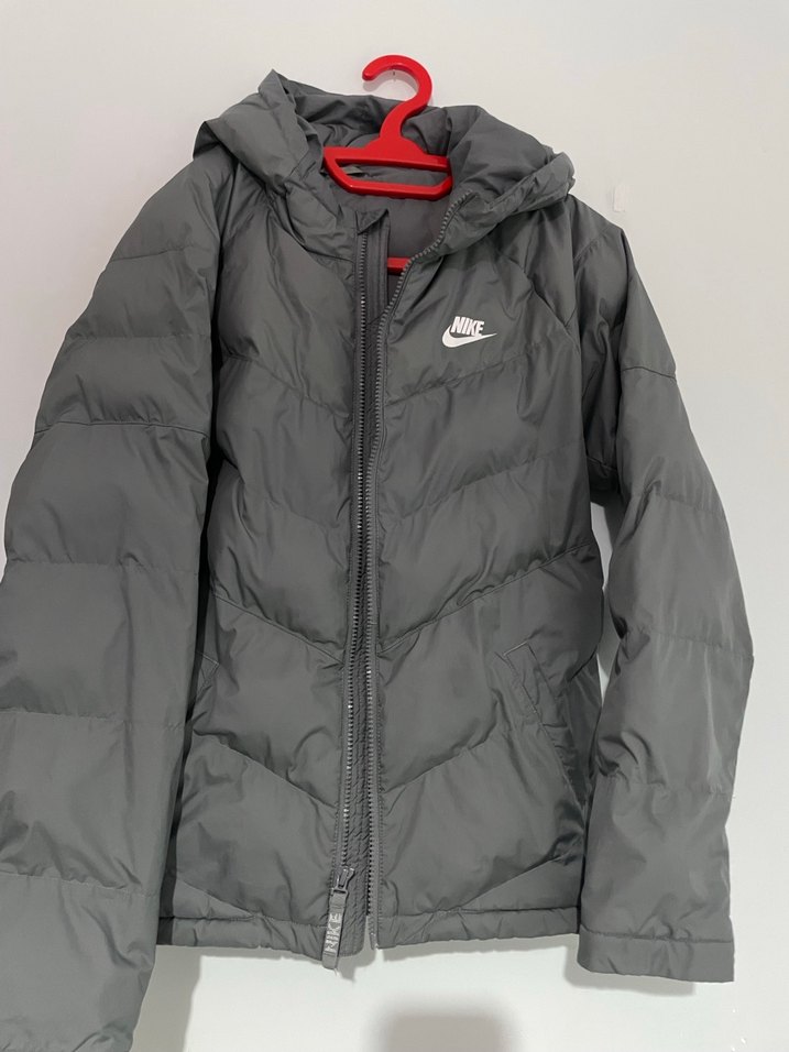 Nike markalı, kapüşonlu ve fermuarlı, yüksek yakalı, normal boyda, gri erkek kışlık mont. Sokak stiline uygun, rahat ve sıcak tutan kumaştan yapılmıştır.