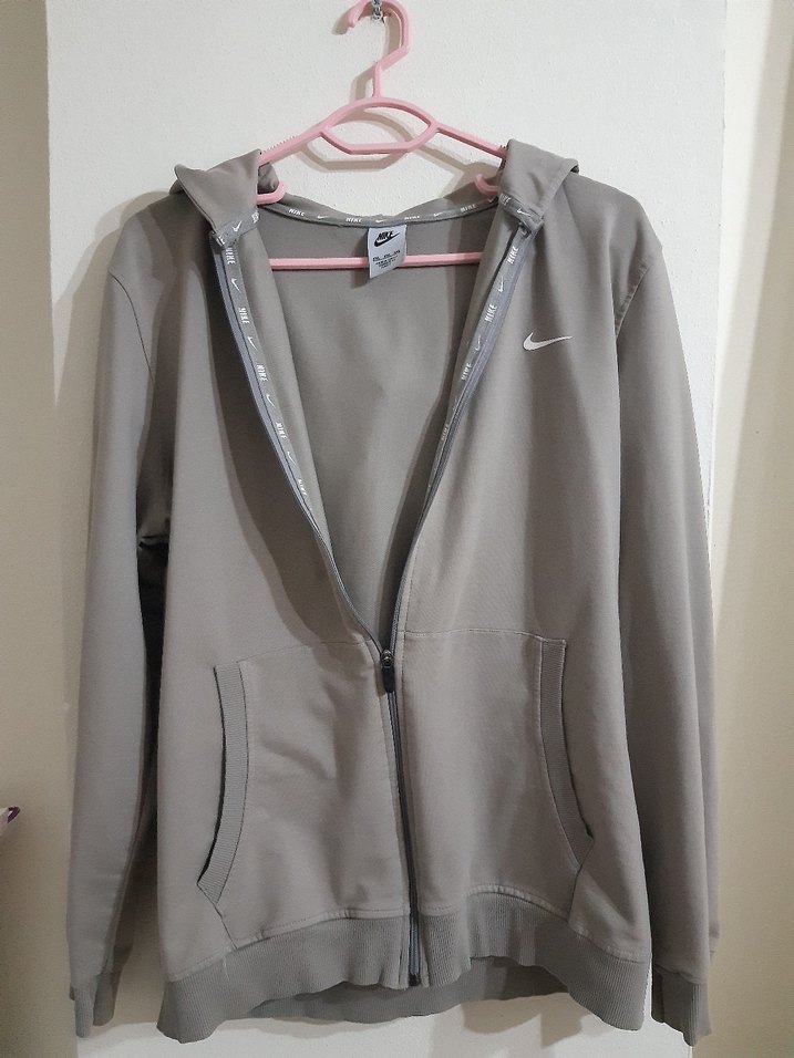 Tertemiz kullanılmıştır. Nike gri kapüşonlu ceket, fermuarlı ve cepli. V yakalı, uzun kollu, normal boyda ve sentetik kumaştan, günlük rahat sokak stili için uygundur.