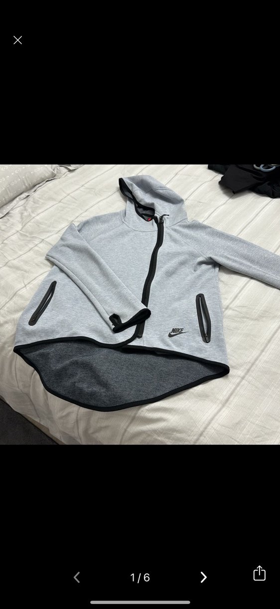 Nike sweatshirt, uzun kollu, yüksek yakalı ve fermuarlı. Yumuşak gri kumaştan, cep fermuarları ve arkası uzun etekli, rahat sokak stili için uygun.