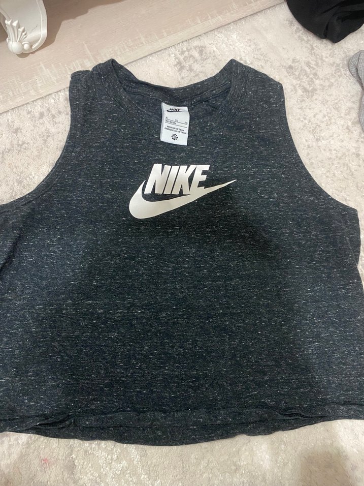 Nike markalı, kısa kesim, kolsuz ve yuvarlak yakalı, yumuşak sentetik kumaştan yapılmış, baskılı logolu spor sokak stili üst. ♀️
