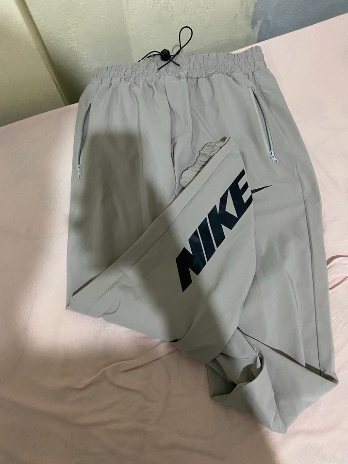 Gri renk, rahat kesim erkek eşofman altı, fermuarlı cepler ve lastikli bel bandı ile. Nike logosu bulunur, yumuşak sentetik kumaştan yapılmıştır.