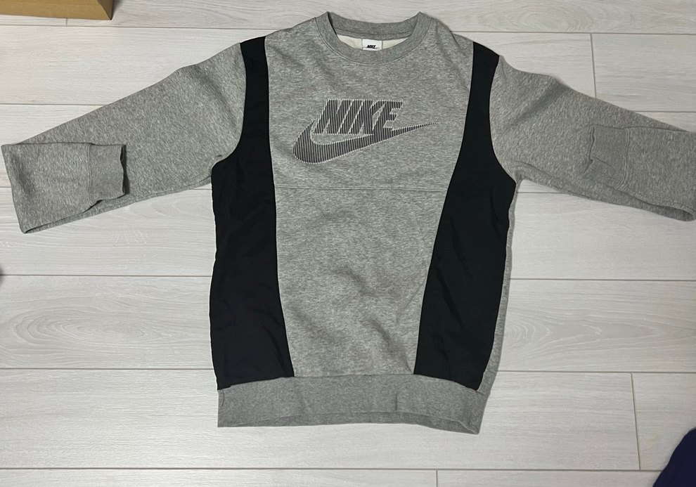 Nike gri ve siyah renk bloklu, uzun kollu, yuvarlak yakalı sweatshirt. Sentetik kumaştan, sportif ve rahat kullanım için uygun.