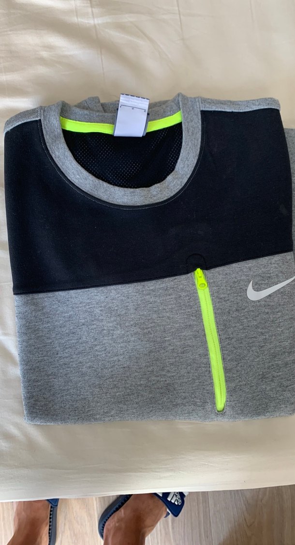 Nike marka, gri ve siyah renk bloklu, fermuarlı erkek sweatshirt. Uzun kollu ve bisiklet yakalı, neon detayları ile sokak stili için uygun.