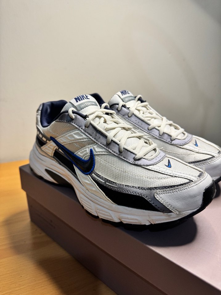 Nike markalı beyaz ve gri renkli erkek spor ayakkabısı, bağcıklı ve stiletto topuklu tasarıma sahip, spor ve sokak stilini birleştirir.