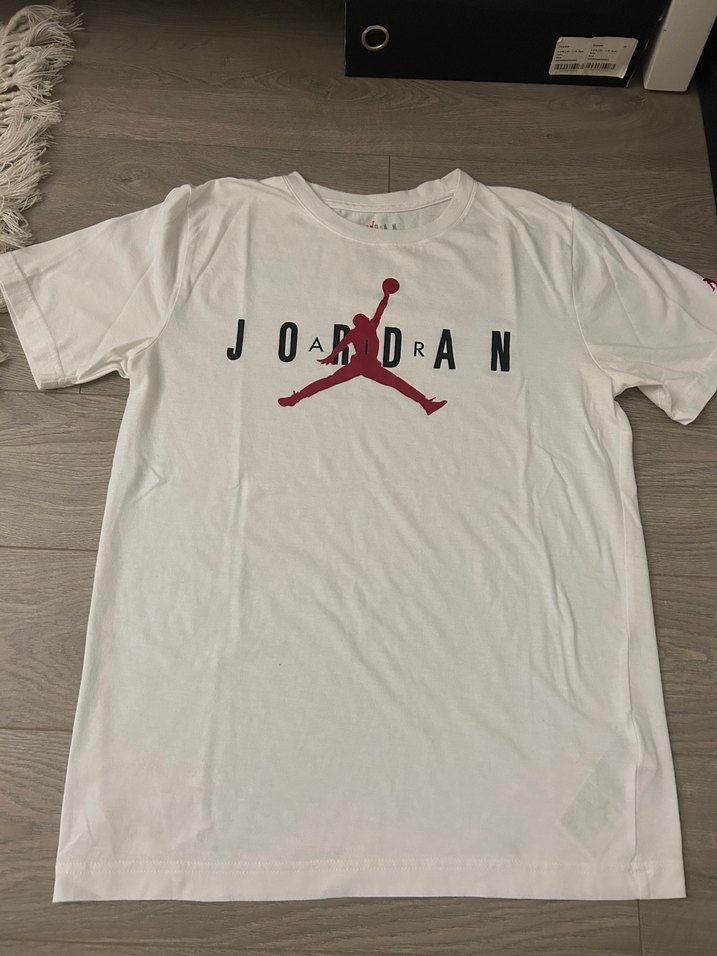 Nike Jordan baskılı, beyaz renk, rahat kesim t-shirt. Günlük kullanım için idealdir. sayılı kullandım erkek çocuk reyonundan 13-15 yaş olarak geçiyor, s bedenim bana rahatlıkla oldu, orijinaldir mağazadan alındı, alana hayırlı olsun