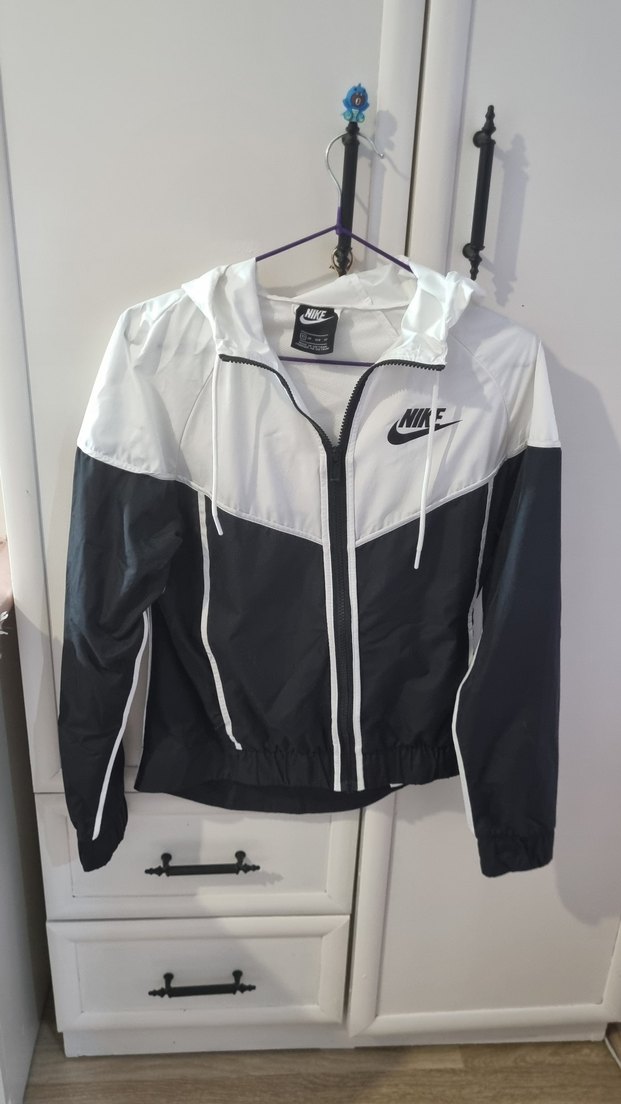 Nike yağmurluk, beyaz-siyah renklerde, kapüşonlu ve fermuarlı. Yüksek yakalı, uzun kollu ve vücuda oturan kesimle sportif tarz sunar. ️