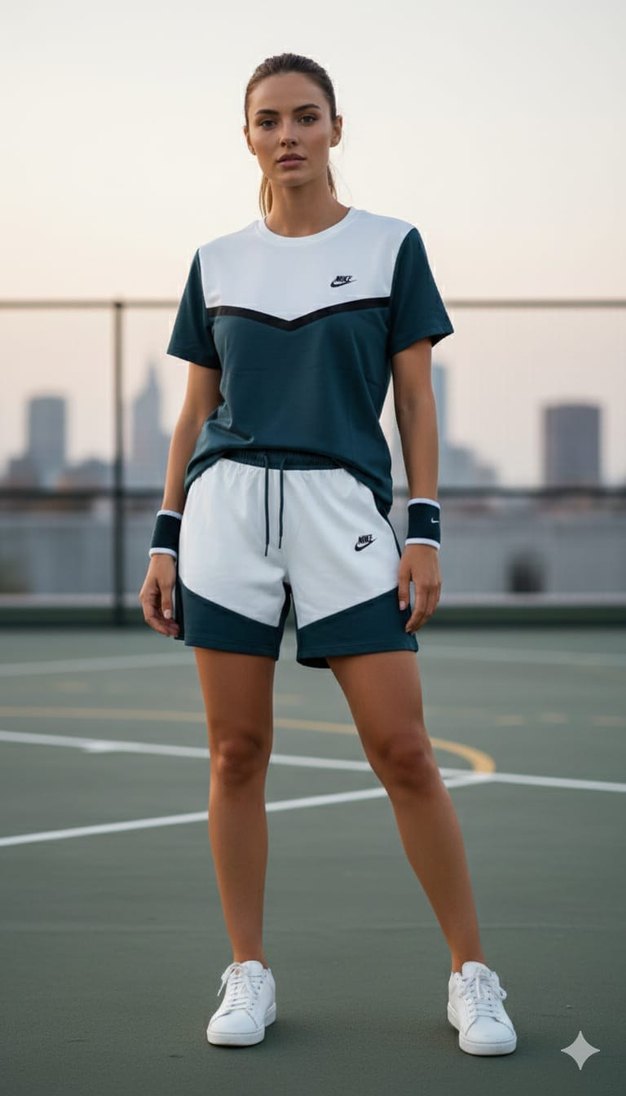 Nike kadın spor takımı, bol kesim, kısa kollu ve yuvarlak yaka. Gri ve beyaz renk bloklu, sentetik kumaştan, sportif sokak stili için uygundur. ♀️