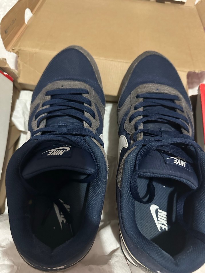 Nike kadın spor ayakkabıları, dolgu topuklu ve bağcıklıdır. Mavi ve gri renklerde, kauçuk tabanlıdır ve spor ile günlük kullanıma uygundur. 44 numara