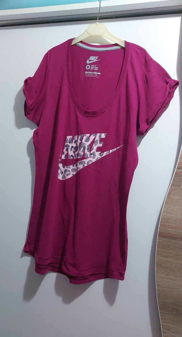 Nike kadın pembe kısa kollu tişört, bol kesim ve baskılı logo ile. İpeksi kumaştan, parlak görünümlü, bisiklet yaka tasarımlı, spor şıklık için uygun. ♀️ Orijinal ürün.