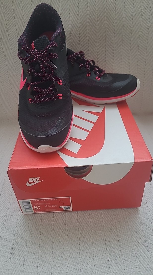 Nike markalı, pembe ve siyah renkli, bağcıklı, baskılı kadın spor ayakkabısı, düz tabanlı, sokak modasına uygun.orijinal Nike MD runner 2 pe (gs),deichmann'dan alındı,4-5 kez giyildi,kutulu.