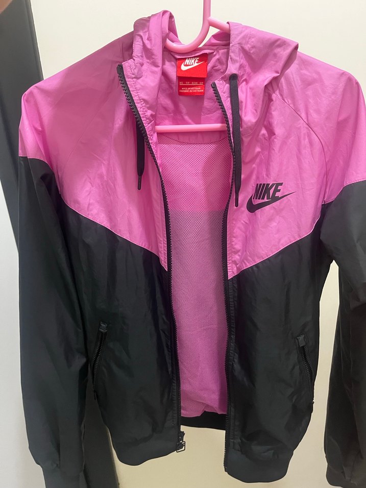 Nike kadın ceketi, sentetik kumaştan, pembe-siyah renklerde, uzun kollu ve fermuarlı. Spor ve günlük kullanıma uygun, normal boyda ve dar kesim.