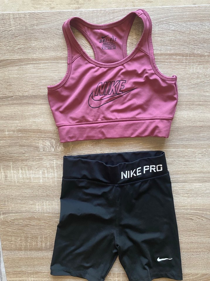 Nike kadın spor sütyeni, pembe, askısız ve satenimsi dokuda, siyah Nike Pro şort ile birlikte. Spor ve günlük şıklık için uygun. ️♀️