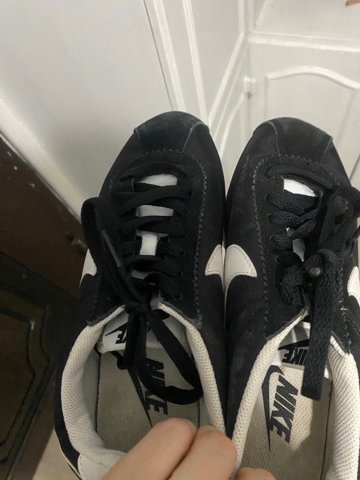 Orjinaldir.Nike kadın spor ayakkabıları, düz topuklu ve bağcıklı, koyu siyah ve beyaz renklerde, sportif ve günlük kullanıma uygun.