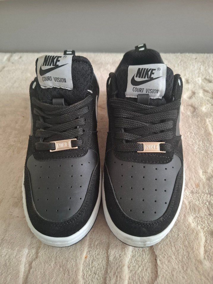 Gri Nike kadın spor ayakkabısı, bağcıklı ve kauçuk tabanlıdır. Stiletto topuklu ve desensiz, spor ve günlük sokak stili için uygundur.