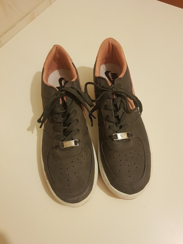 Hiç giyilmedi, sıfır. Koyu gri, nubuk, Nike kadın spor ayakkabı, bağcıklı, günlük kullanım için uygun, sokak stiliyle uyumlu. #sporayakkabı #grisporayakkabı #nikesporayakkabı