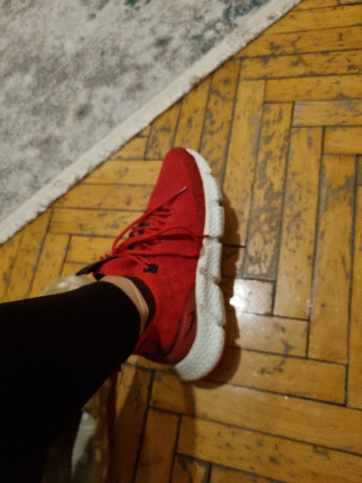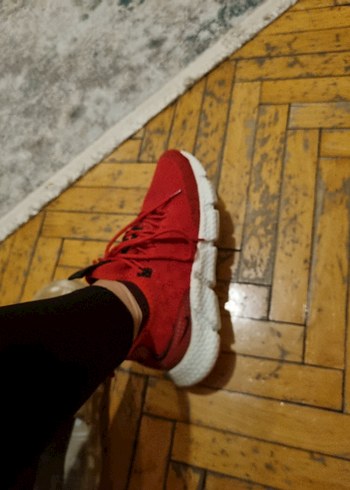 Kırmızı bağcıklı kadın spor ayakkabısı, ince topuklu ve kauçuk malzemeden üretilmiştir. Spor ve sokak stili için renkli bir seçenektir. orjinaldir.sayili kullanıldı