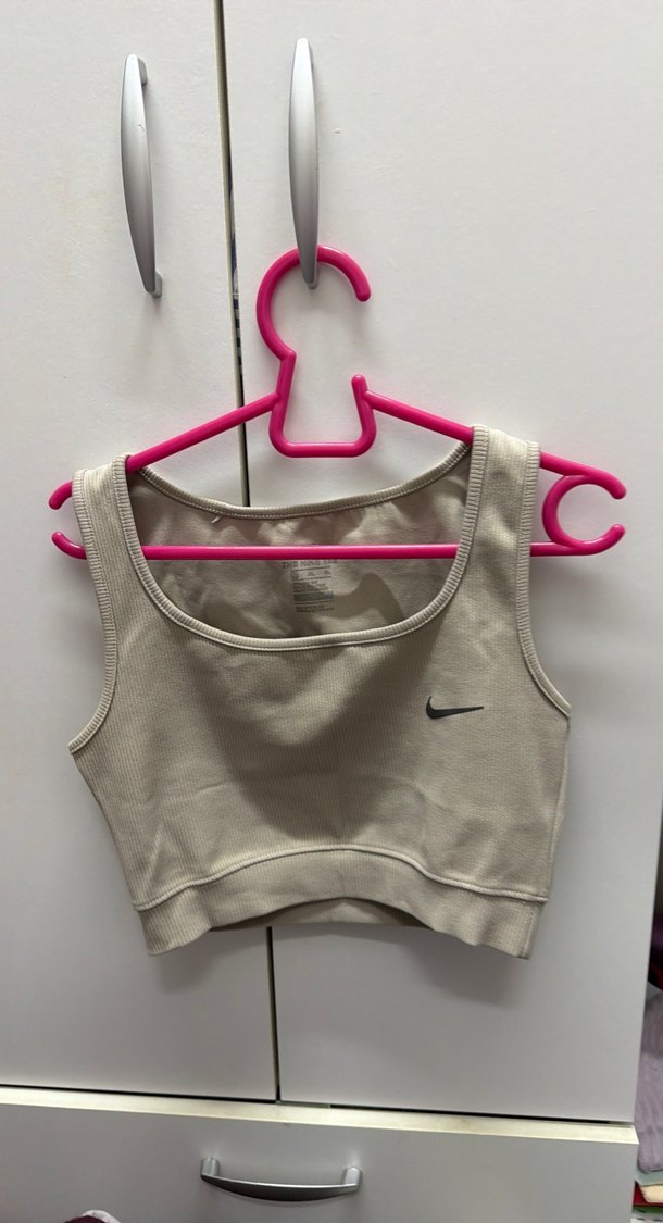Bej renkli, kısa ve kolsuz kadın spor atlet. Sentetik kumaştan, dar kesim ve yuvarlak yaka. Nike logosu ön tarafta, şık ve rahat spor stilinde.