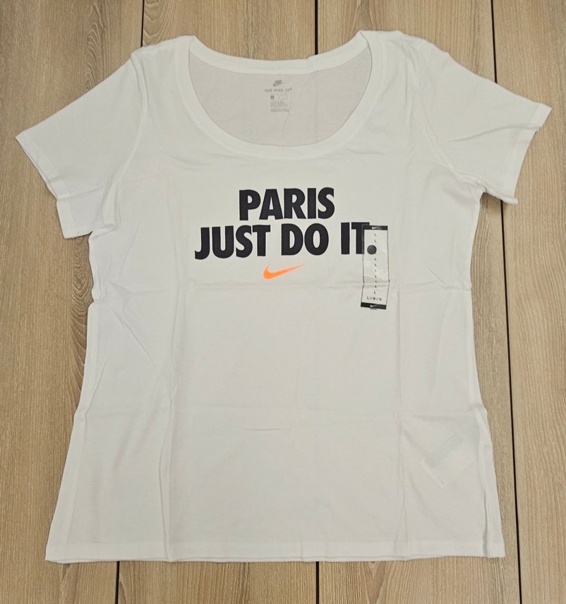 Kullanılmamış sıfır üründür.%100 orijinaldir. L beden .İki koltukaltı arası ölçüm 53 cm., Boy:66...Beyaz pamuklu tişört, kısa kollu ve yuvarlak yaka detaylıdır. Üzerinde 'PARIS JUST DO IT.' baskısı ve turuncu Nike logosu bulunur. Spor ve günlük kullanıma uygundur.
