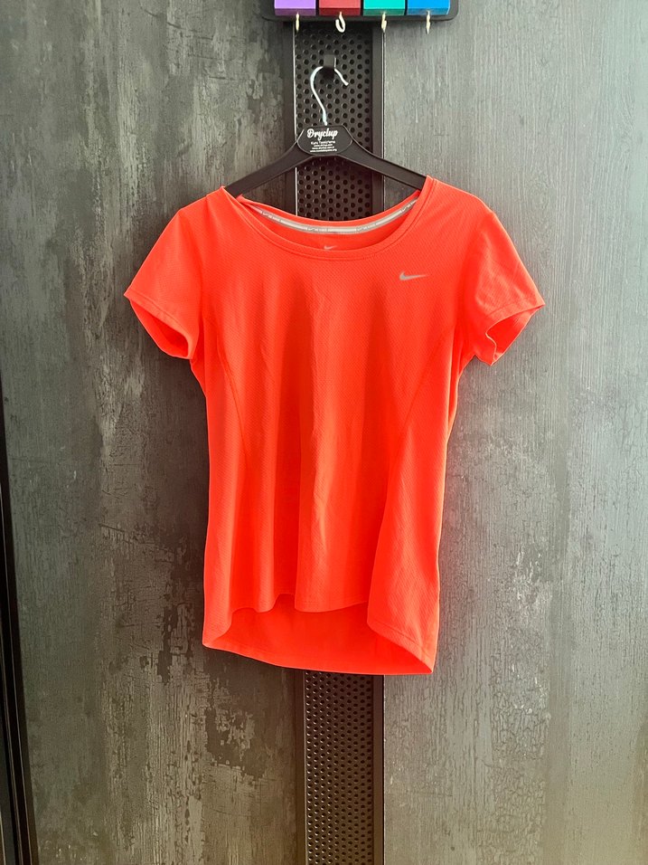 Nike fosforlu turuncu fitted kesim, DRI-FIT teknolojili kadın spor tshirtü. Spor ve streetwear için uygun.