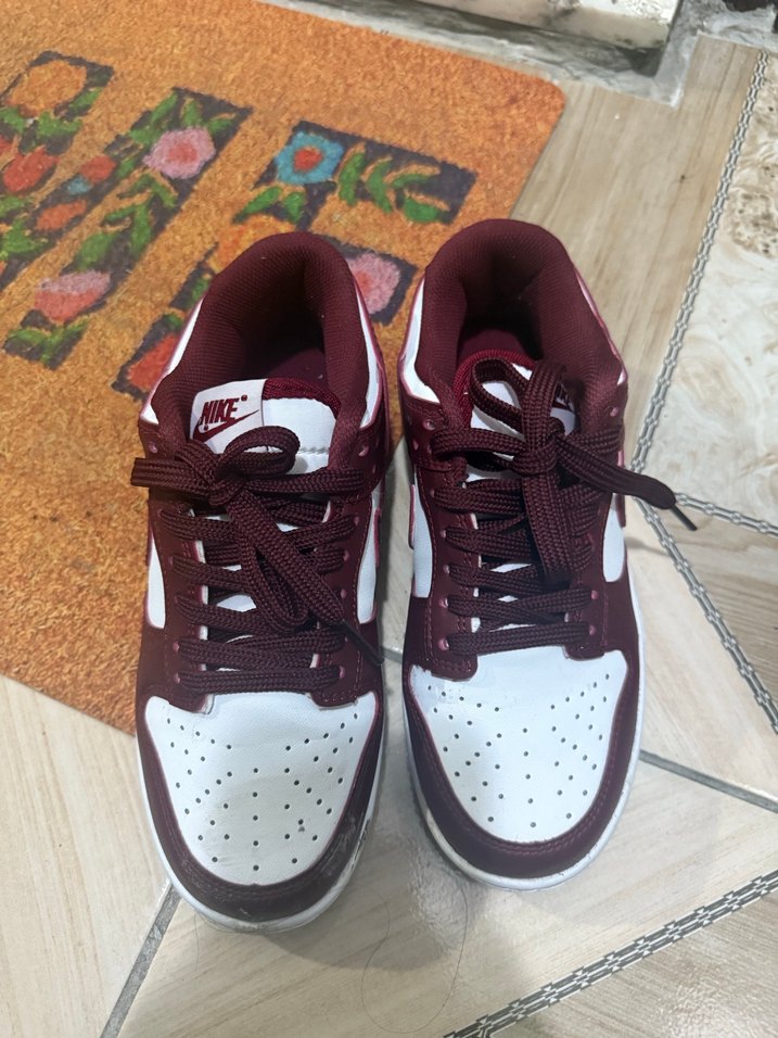 Nike kadın spor ayakkabısı, koyu kahverengi ve beyaz renklerde, bağcıklı, düz tabanlı ve desensizdir.