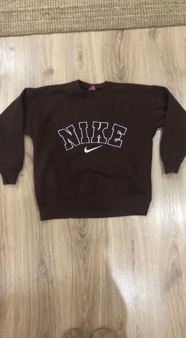 Nike kahverengi sweatshirt, bisiklet yaka ve uzun kollu. Oversize kesim, yumuşak ve sıcak kumaş, baskılı logo detaylı. Spor ve rahat tarz için ideal.