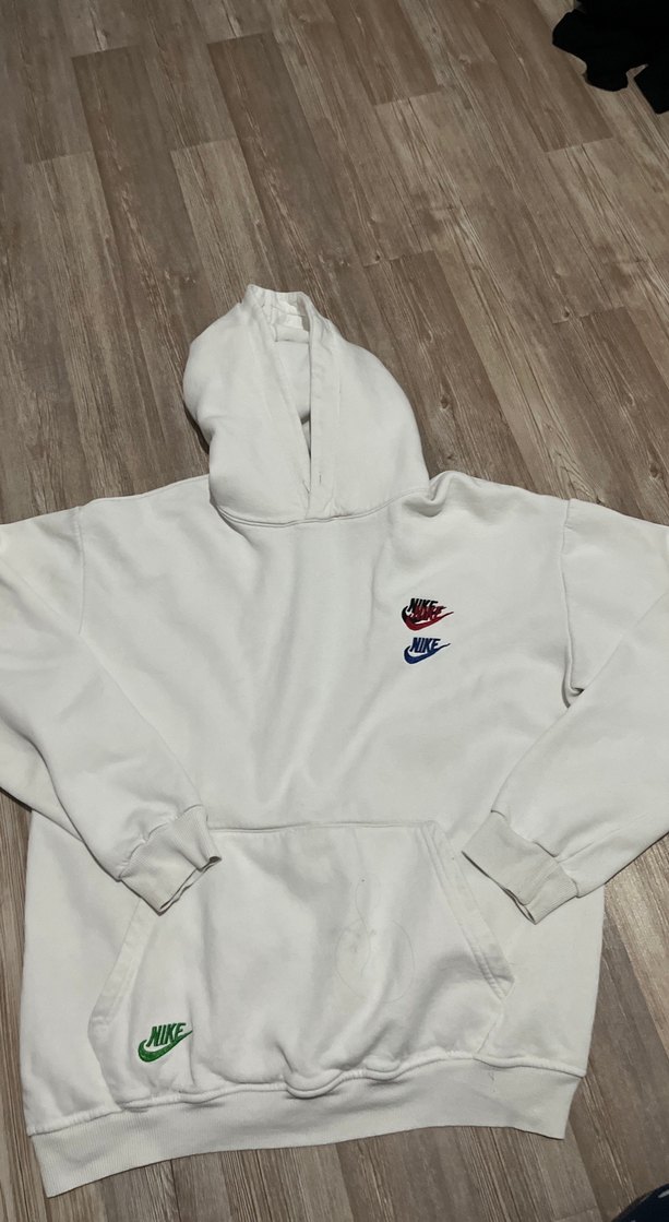 Nike markalı, kapüşonlu beyaz sweatshirt. Rahat kesimli ve uzun kollu, yumuşak dokulu kumaş. Spor ve günlük kullanıma uygun. Lekesi vardır