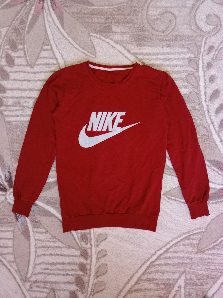 Kırmızı Nike sweatshirt, yuvarlak yaka ve uzun kollu. Rahat kesimi ve yumuşak sentetik kumaşıyla günlük sokak stiline uygun, renkli baskılı tasarım.