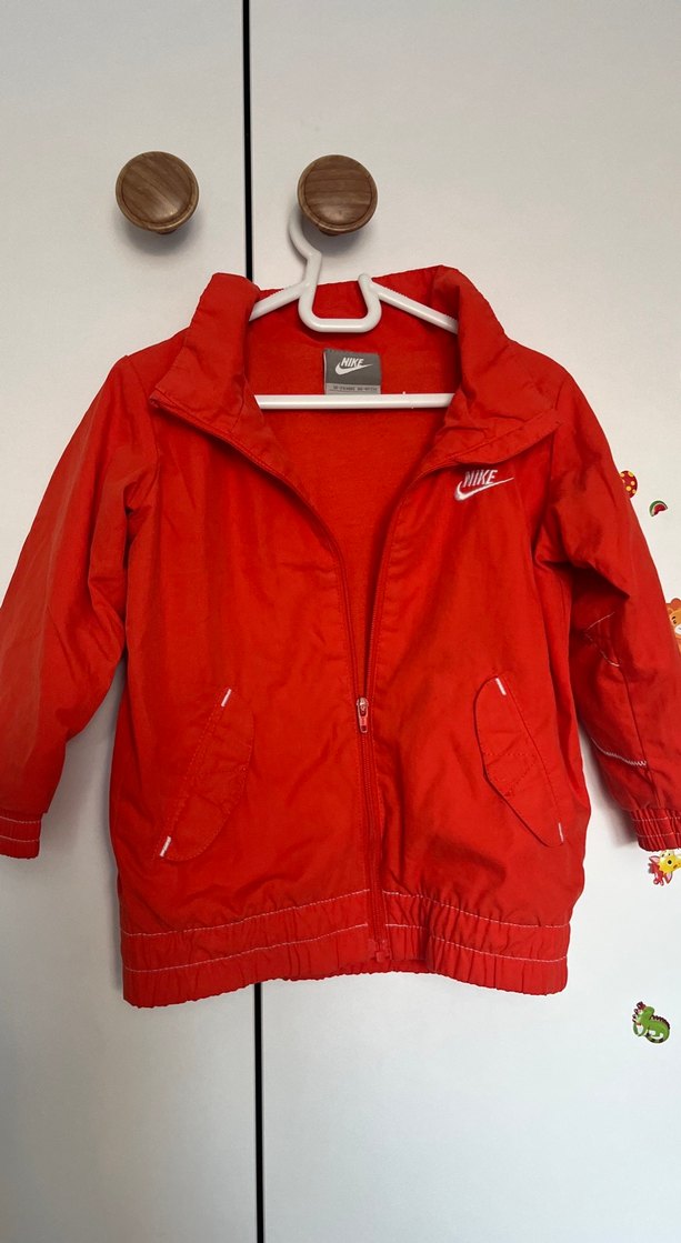 Nike markalı, parlak kırmızı renkte, fermuarlı ve notched lapel yakalı erkek çocuk ceketi. Rahat kesim ve yumuşak, sıcak tutan kumaş kullanılmış.