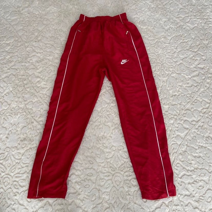 Nike markalı, parlak kırmızı renkte, rahat kesim ve fermuarlı ceplere sahip kadın eşofman. Yumuşak ve sıcak kumaştan, beyaz şerit detaylı midi boy, spor ve gündelik kullanıma uygun. ♀️
