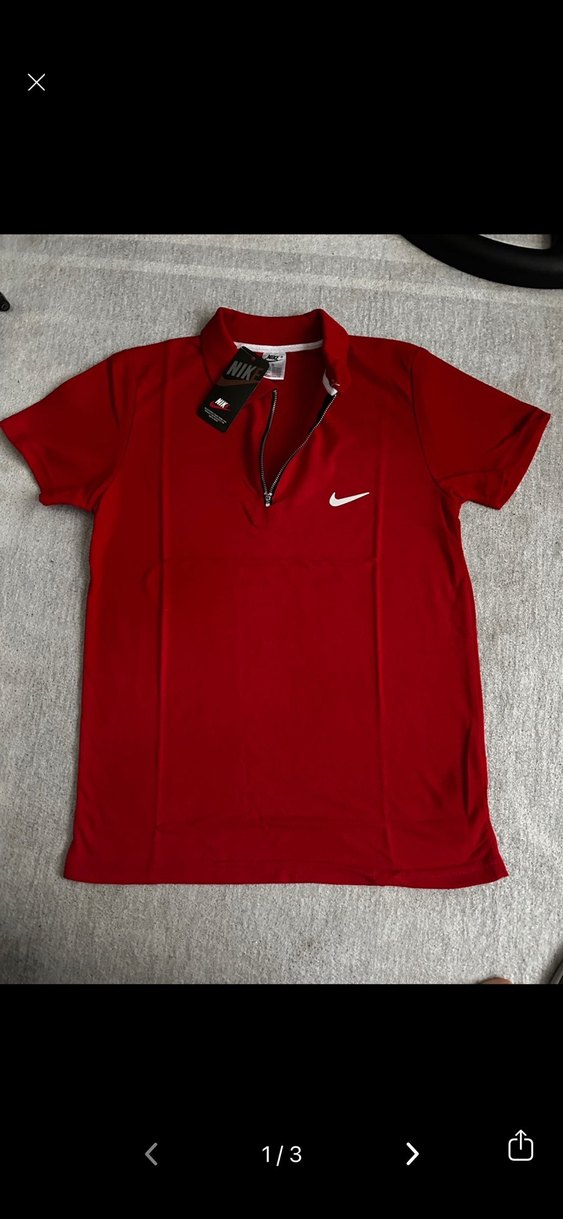 Nike erkek tişört, fermuarlı polo yaka ve kısa kollu. Canlı kırmızı sentetik kumaştan, rahat ve şık günlük kullanım için uygun.