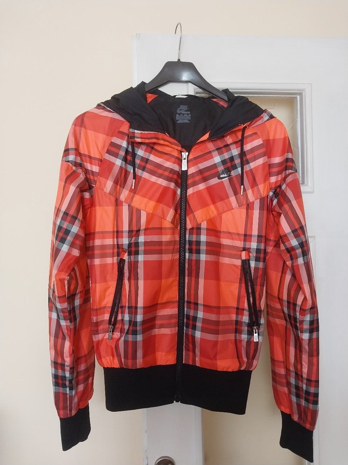 Kırmızı kareli, kapüşonlu ve fermuarlı kadın ceketi, sentetik kumaştan, uzun kollu ve günlük kullanıma uygun.
