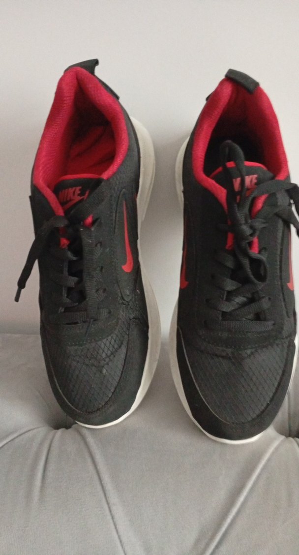 Nike kadın spor ayakkabısı, koyu kırmızı ve siyah renkte, bağcıklı ve ince topukludur. Spor ve şık günlük kullanım için kauçuk tabanlıdır.orjinal değildir