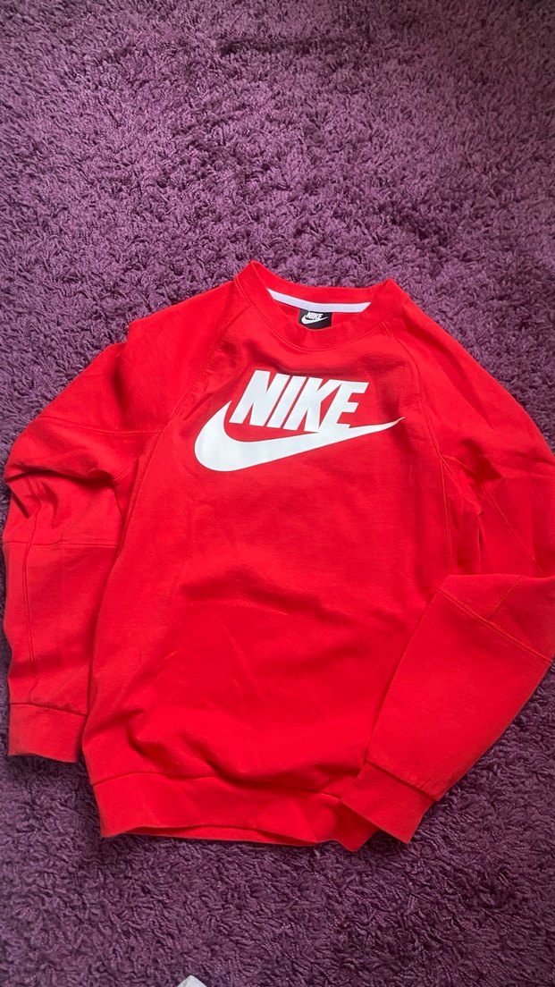 Nike marka, uzun kollu, yuvarlak yaka, rahat kesim kırmızı sweatshirt. Yumuşak örme kumaştan, spor ve günlük kullanıma uygun.