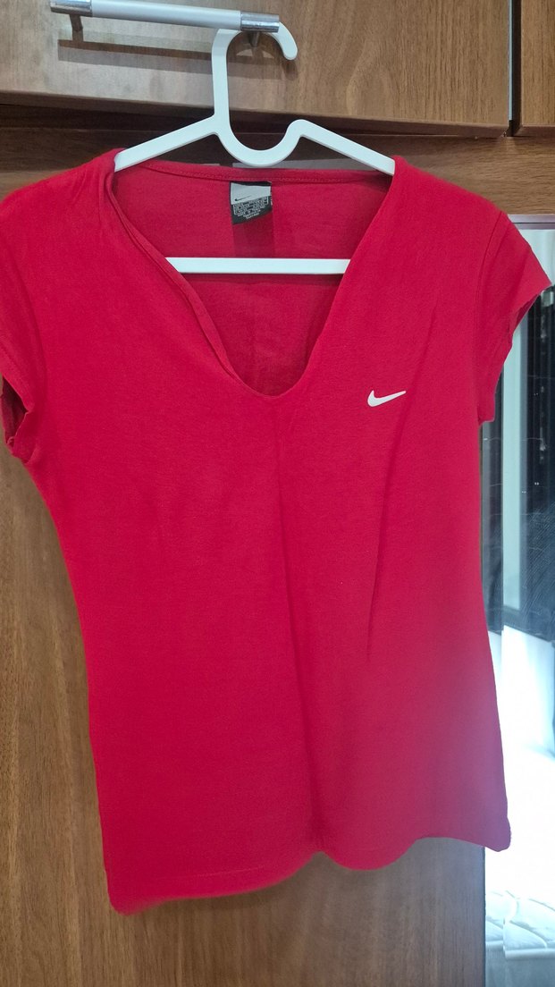 Nike markalı, kırmızı renkte, V yakalı ve kısa kollu, ince ve vücuda oturan kadın tişörtü. Spor ve günlük kullanıma uygun. Biraz tüylenme var.