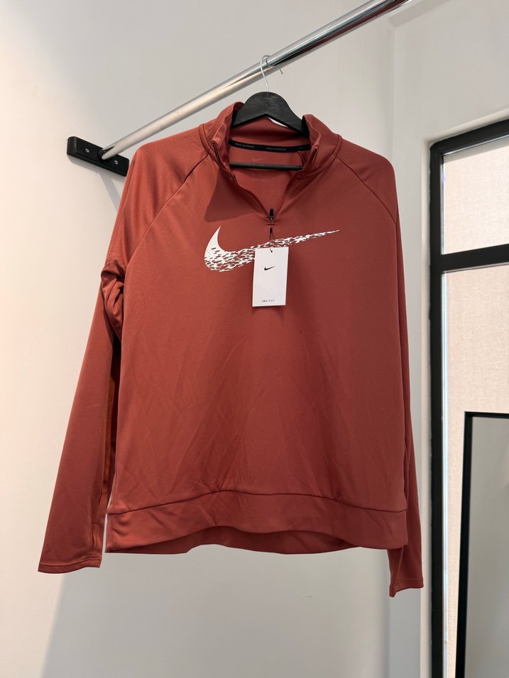 Koyu kırmızı, uzun kollu ve yüksek yakalı sweatshirt. Baskılı logo ve yarım fermuar bulunur. Yumuşak sentetik kumaştan, bol kesim ve normal boyda, spor ve günlük kullanım için uygun. Ürün sıfırdır, ufak bir hatası vardır görsellerdeki gibidir. Kullanıma engel değildir. #nike