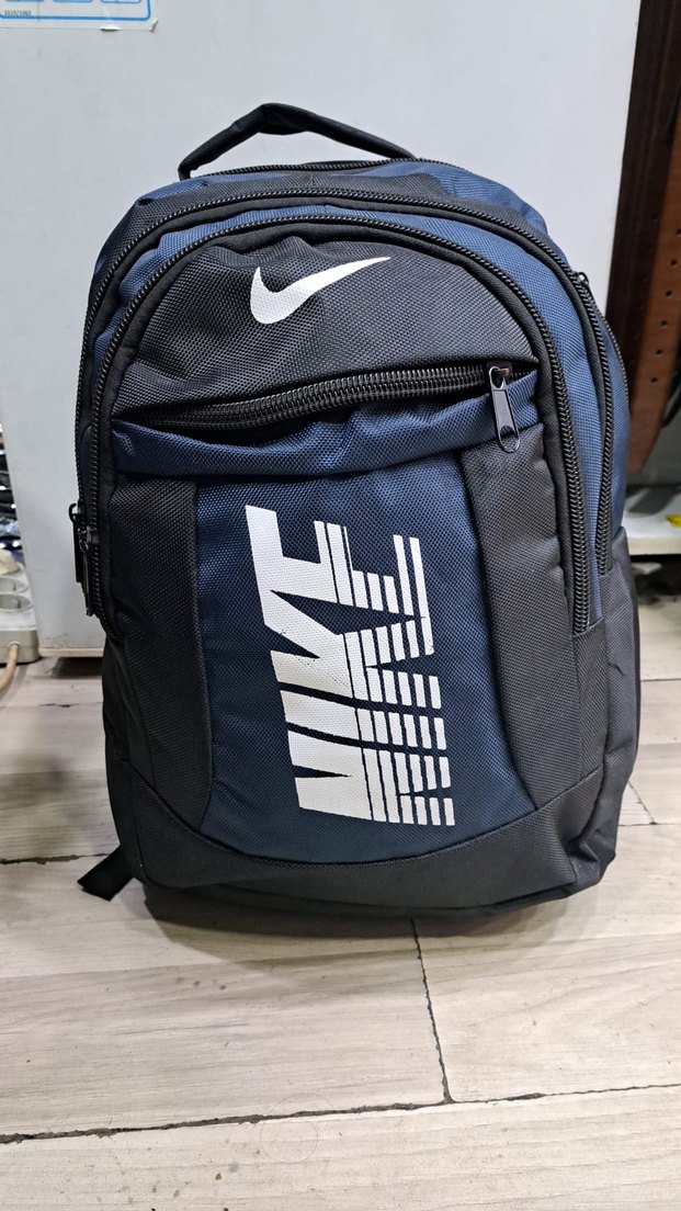 Nike marka, fermuarlı cepleri ve koyu lacivert baskılı deseniyle erkek sırt çantası. Trendy casual sokak stiline uygun. Mağaza ürünüdür
