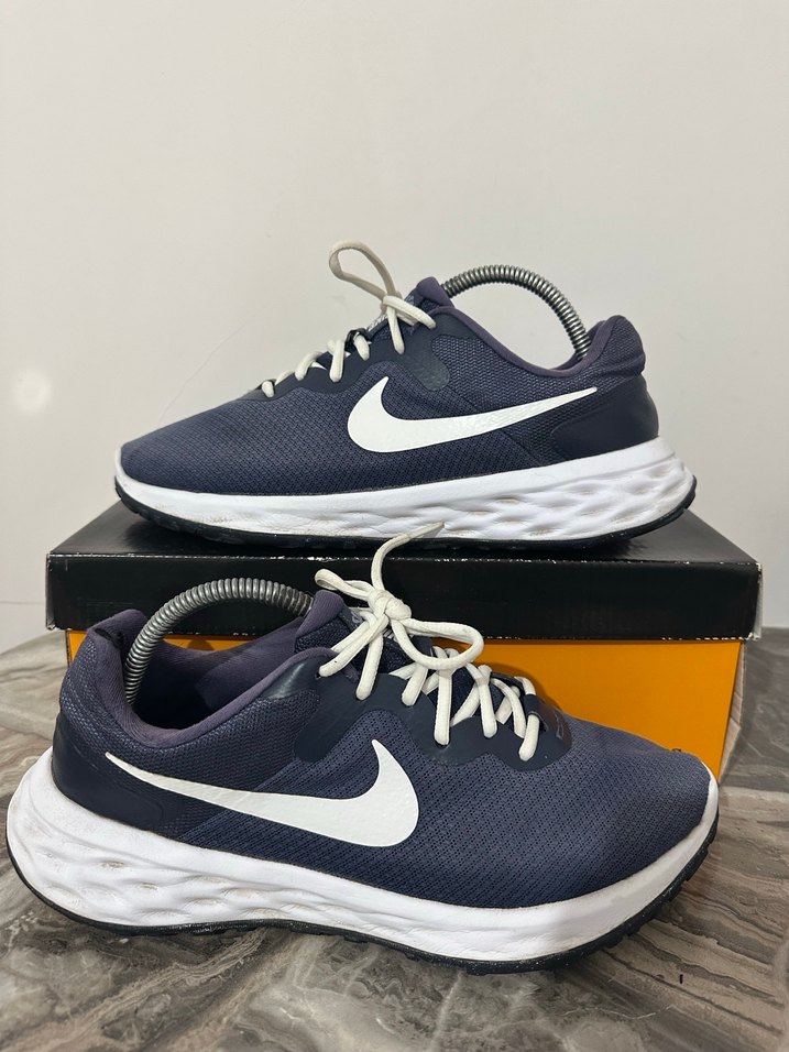 Lacivert renkli Nike erkek spor ayakkabısı, beyaz baskılı logo ve elastik detaylarla, rahat kauçuk tabanlı, sokak stili ve spor için uygundur.