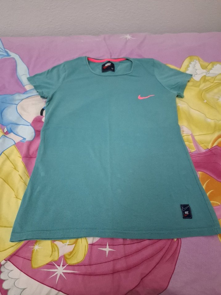 Nike Kısa kollu, yuvarlak yaka, yeşil renkli tişört Üzerinde pembe logo baskısı bulunur. likralı Rahat pamuk kumaştan üretilmiştir.