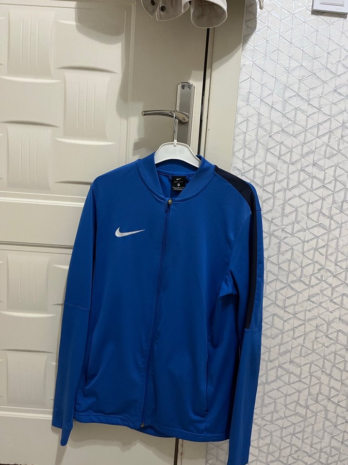 Nike markalı, koyu mavi renkte, uzun kollu ve bisiklet yaka, fermuarlı ve cırt cırt detaylı, sentetik kumaştan erkek spor ceketi. ♂️ M beden