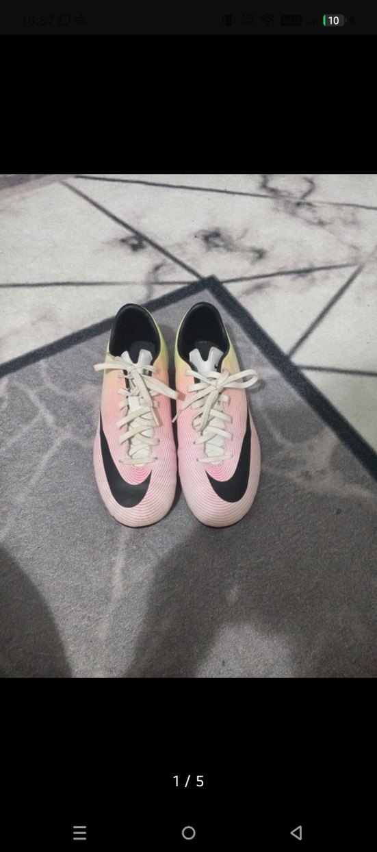 Pastel pembe bağcıklı, tie-dye desenli erkek futbol ayakkabısı, dayanıklı kauçuk malzemeden üretilmiştir. ⚽