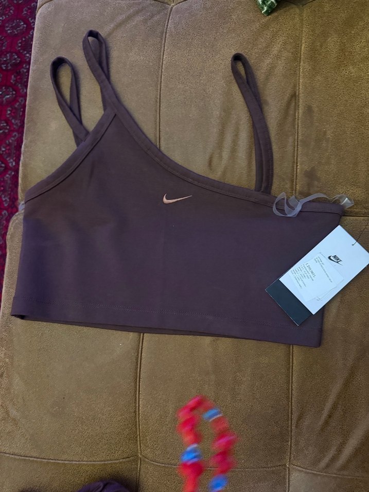Nike marka, ince askılı, baskılı logolu koyu kahverengi mini spor sütyeni, sokak stili için uygun. ♀️Rahat kot üstüne bile giyilicek tarzda